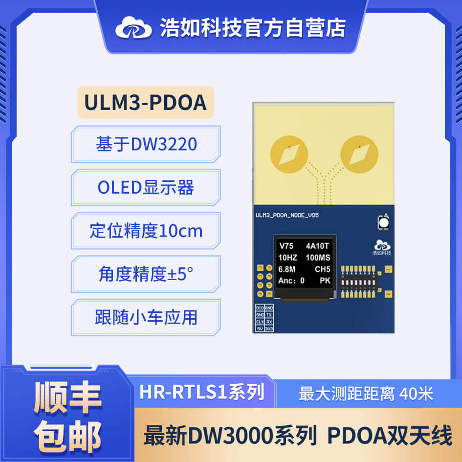 ULM3-PDOA 模塊是大連浩如科技 HR-RTLS1 系列產(chǎn)品基于最新 DW3000 系列芯片的 PDOA 定位模塊,采用 DecaWave 官方 DW3220 作為核心 UWB 芯 片,采用 STM32F103CBT6(根據(jù)市元器件價(jià)格浮動(dòng)情況和批次不同或其完全兼 容的 GD32F103CBT6)單片機(jī)作為主控 MCU,板載 OLED 顯示器,具有簡(jiǎn)單易 用、高精度、體積小巧等特點(diǎn)。 ULM3-PDOA 模塊一般作為基站使用,可搭配 ULM3、ULM3-PA 或 ULM3- SH 作為標(biāo)簽,構(gòu)成單基站 PDOA 定位系統(tǒng)或跟隨系統(tǒng)。